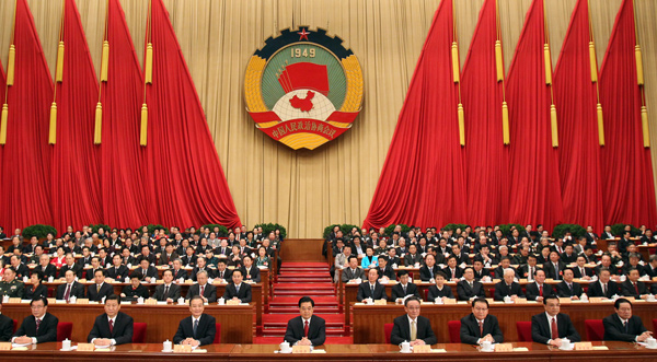3月3日下午,中国人民政治协商会议第十一届全国委员会第三次会议在北京人民大会堂开幕。这是党和国家领导人胡锦涛、吴邦国、温家宝、贾庆林、李长春、习近平、李克强、贺国强、周永康等步入会场。新华社记者兰红光摄