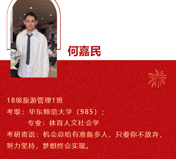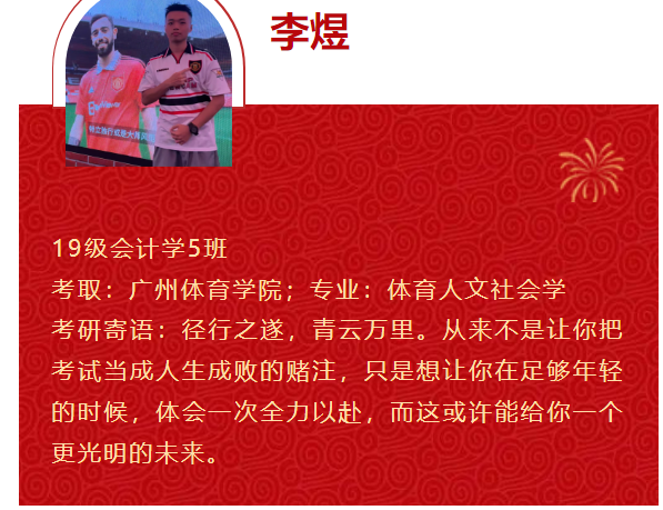 体育教学部积极响应集团和学校全方位培养华商人才的精神,服务好学生,体育教学部在一年前就在各代表队中物色热爱体育并具有一定潜质及考研意向的学生,为他们的择校、选专业以及专业课学习上提供指导。最终,来自18级旅游管理1班的何嘉明同学成功被华东师范大学录取为体育人文社会学学术型硕士,来自19级会计学5班的李煜同学成功被广州体育学院录取为体育人文社会学学术型硕士。