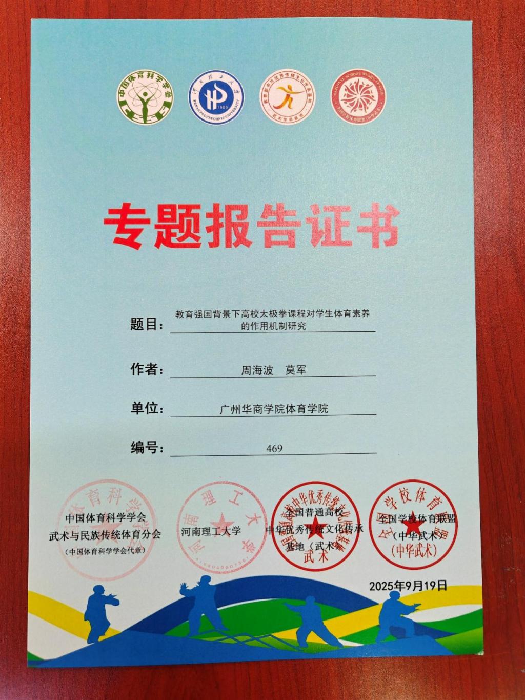 9月18日至19日,以“共享太极 共享健康”为主题的2025年太极拳科学大会在太极拳发源地河南理工大学隆重举行。广州华商学院体育学院副教授、硕士生导师周海波博士受邀参会,并于9月19日分论坛作专题报告,分享其在教育强国背景下高校太极拳课程对学生体育素养作用机制的前沿研究成果。
