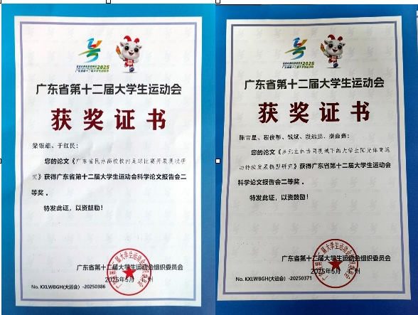 近日,广东省第十二届大学生运动会科学论文报告会评选结果揭晓,我校体育学院教师研究成果表现突出,荣获两项二等奖,展现了我校体育科学研究的扎实功底与创新活力。