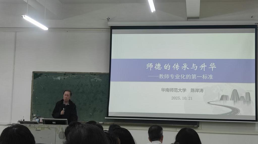 本次培训特邀华南师范大学陈岸涛教授主讲。陈岸涛教授作《师德的传承与升华——教师专业化的第一标准》专题培训,陈教授结合自身丰富的教育经验,从高等教育发展趋势切入,系统阐述了师德师风建设的时代意义与核心要求。他指出,当前高等教育已从精英化迈入普及化阶段,未来生源结构变化将推动教育行业进入质量竞争时代,师德师风成为教师职业发展的生命线。