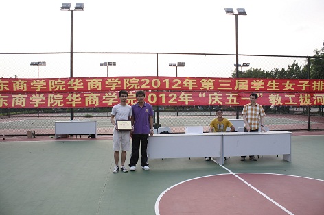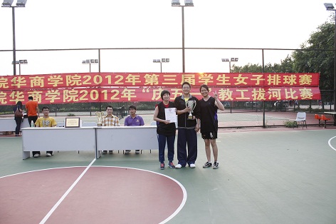 我院第三届学生女子排球赛经过6天的激烈角逐,于2012年4月24日星期二下午在我院排球场落下帷幕。全院8各队经过紧张激烈的争夺,最终旅游管理系获得冠军,工商管理系获得亚军,会计系获得季军,艺术系获得体育道德风尚奖,陈慧敏等6位选手获得优秀运动员称号。闭幕式上,体育教学部领导为以上获奖单位和个人颁发了证书和奖牌,并一起合影留念。