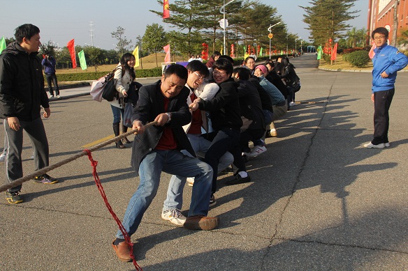比赛场地上,冬日的艳阳高照,校庆的热闹氛围和喜庆的场面将现场的比赛气氛渲染的同天气一样热烈、奔放。“准备好,准备好……”“身体往后,脚步都摆好……”“绳子,把绳子拉直……”这些平时在课堂上、工作中一丝不苟的教职工们在拔河场上同样不含糊。裁判员一声令下,令旗一挥,比赛开始了。只见场上的队员们咬紧了牙,憋红了脸,弓起了腿,使出了浑身的劲儿拉着绳子;而每个参赛队的“啦啦队”员们也用力挥着双手,握紧了拳头,大声地喊着,“加油——加油——”有的人三局比赛下来,嗓子都喊哑了。正是他们整齐一致的加油声,使场上队员的力量在瞬间凝聚在一起,爆发出来。