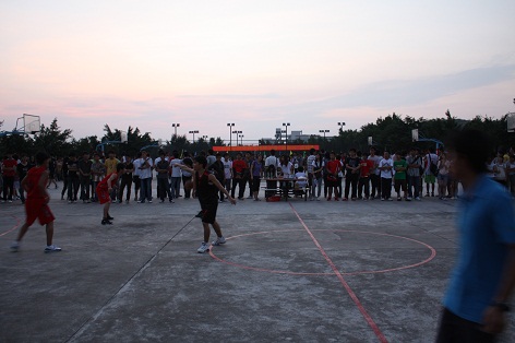 简短开幕式结束,紧接着进行激烈的篮球比赛。为确保比赛的公平公正,本次比赛的裁判全部由体育教学部的老师担任。今天比赛有男女各四个队共四场比赛。在1、2号场的是男子组:行政管理系对艺术系,企业管理系对文学系,在3、4号场的是女子组:行政管理系对艺术系,企业管理系对文学系。比赛一开始观众们就把篮球场围了个水泄不通,各系的系旗高高飘扬。队员们经过前段时间的积极训练,球技、默契明显有所增加。抢球、传球、射篮一气呵成,动作干脆利落,赢得在场观众阵阵热烈地欢呼。场外其他系还未比赛的球员也在旁观看,他们告诉记者:这场比赛很精彩,他们要观察比赛队员们的策略,找出对策以便有更大的把握获胜。